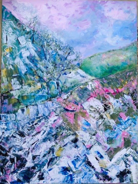 My friend, Mary, went on holiday to the Isle of Arran in Scotland. She had a wonderful time there even though it rained from start to finish! Anyway, she sent me some beautiful photographs of her walks around the island, all rather grey and dismal. I decided to transform them in my paintings to a warm, sunny spring day, using my favourite pinks and purples.